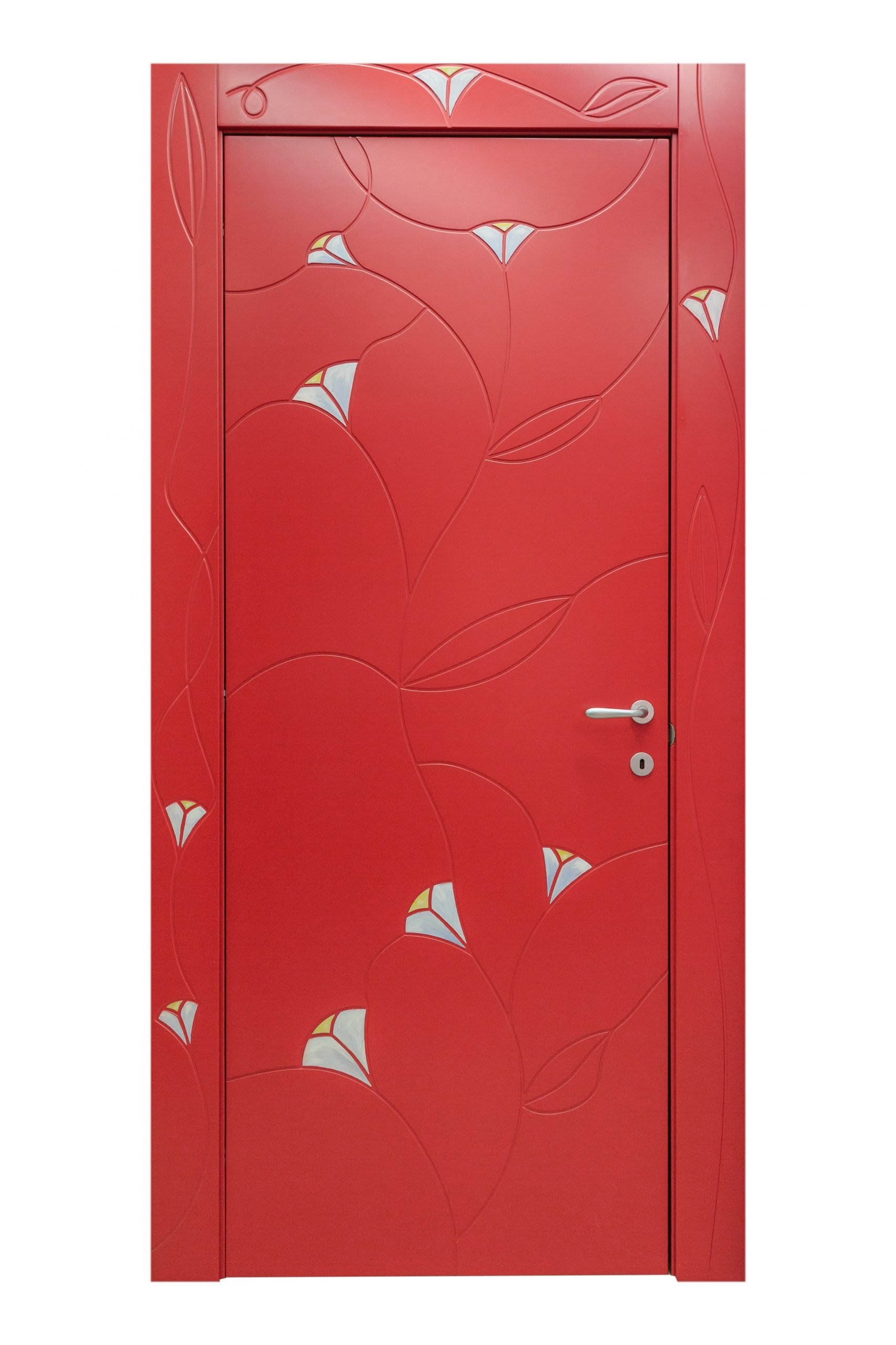 Porta in stile moderno con laccatura rossa opaca e incisioni floreali realizzate mediante controllo numerico, gli elementi floreali sono dipinti a mano da un’artista locale ( è possibile personalizzare il disegno da realizzare sulla porta).