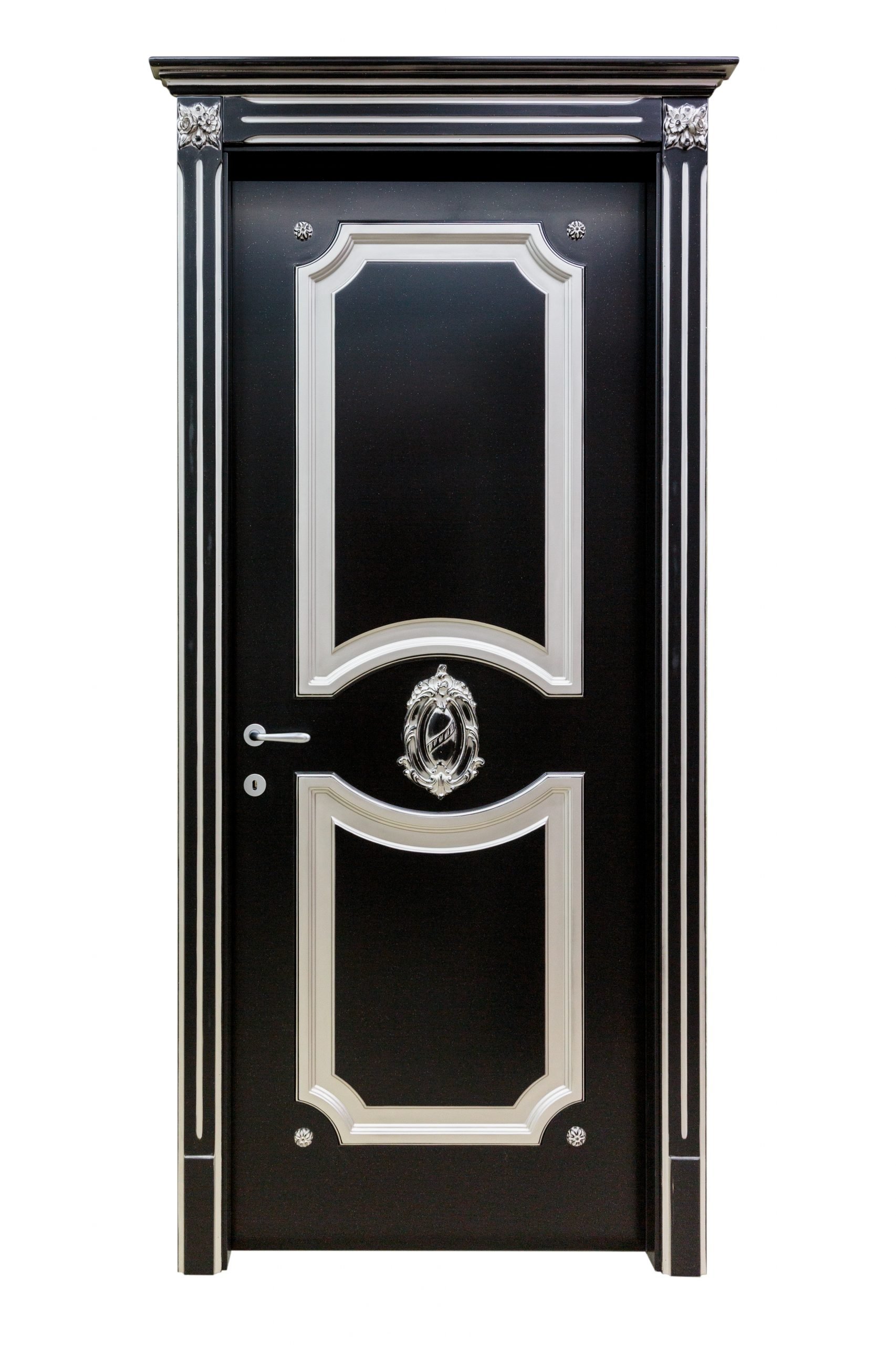 Porta classica, lavorazione scorniciata con base nera sfumata in argento vivo, inserti lavorati a mano per ambienti particolari.