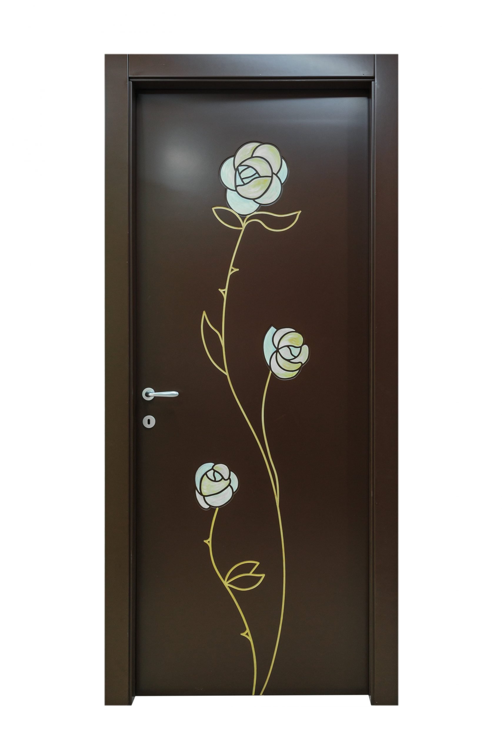 Porta in stile moderno con laccatura marrone opaca e incisioni floreali realizzate mediante controllo numerico, gli elementi floreali sono dipinti a mano da un’artista locale ( è possibile personalizzare il disegno da realizzare sulla porta)