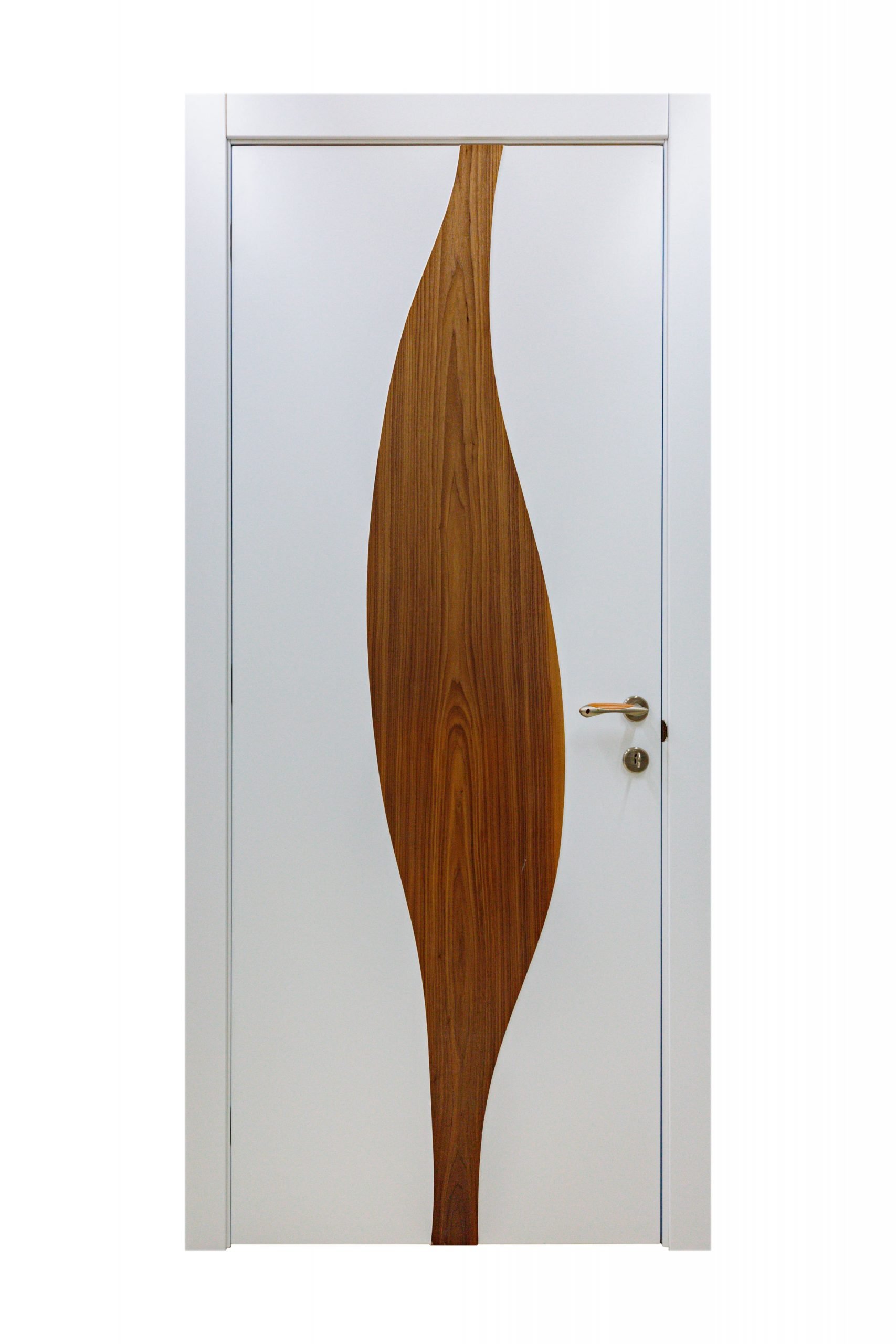 Porta moderna, lavorazione effetto tridimensionale a rilievo con trancia in noce canaletto che spicca su una base bianca opaca.È possibile personalizzare il seguente modello in diversi aspetti.