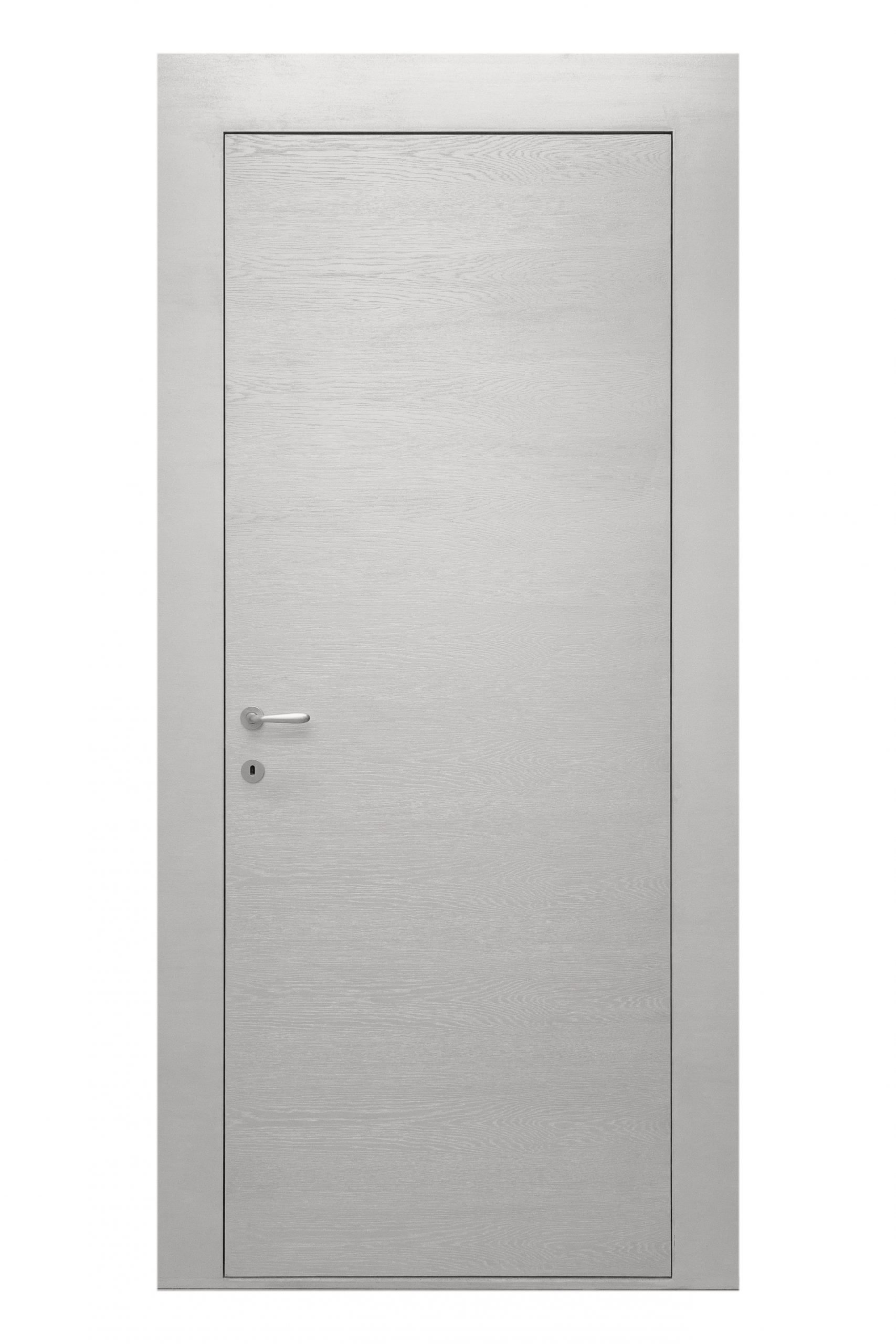 Porta in stile moderno a filo muro in legno rovere spazzolato con verniciatura silver effetto speciale. Ferramenti innovativi con sistema calamita.È possibile personalizzare il seguente modello in diversi aspetti.