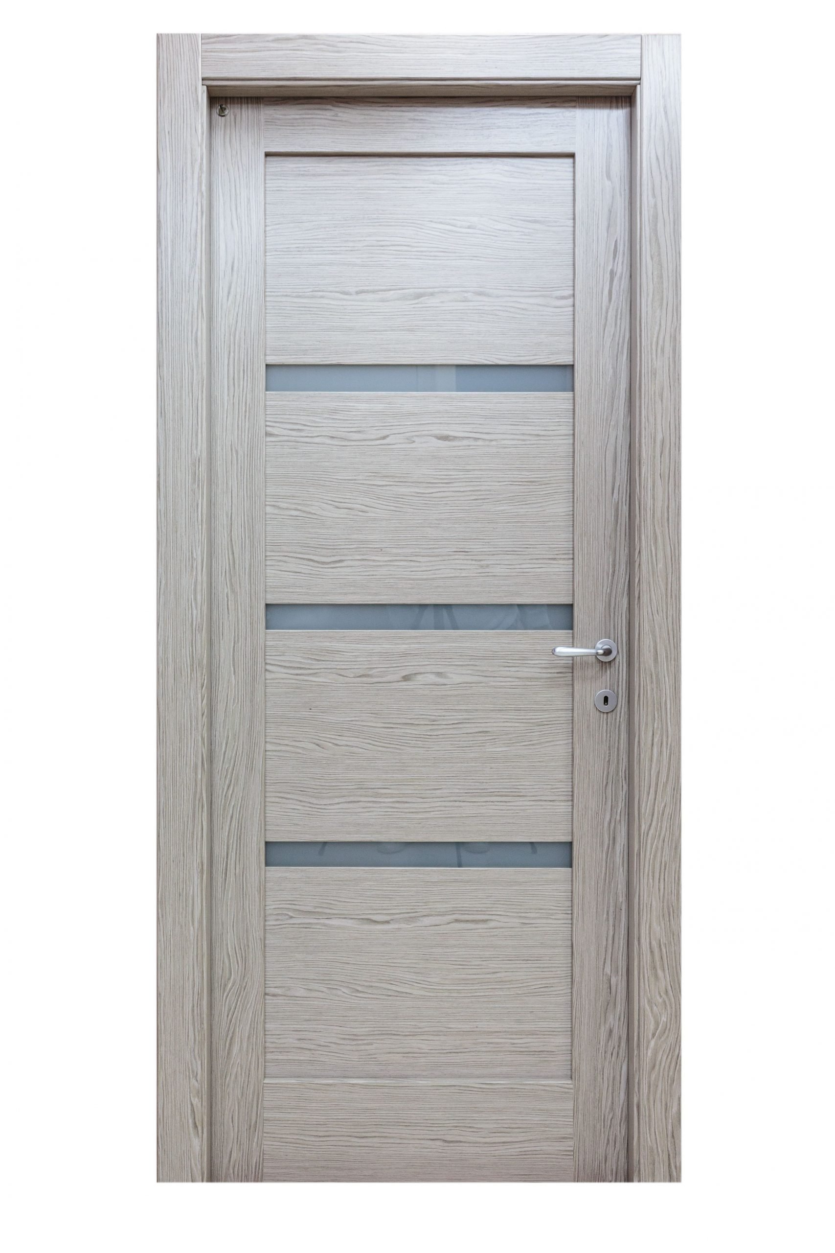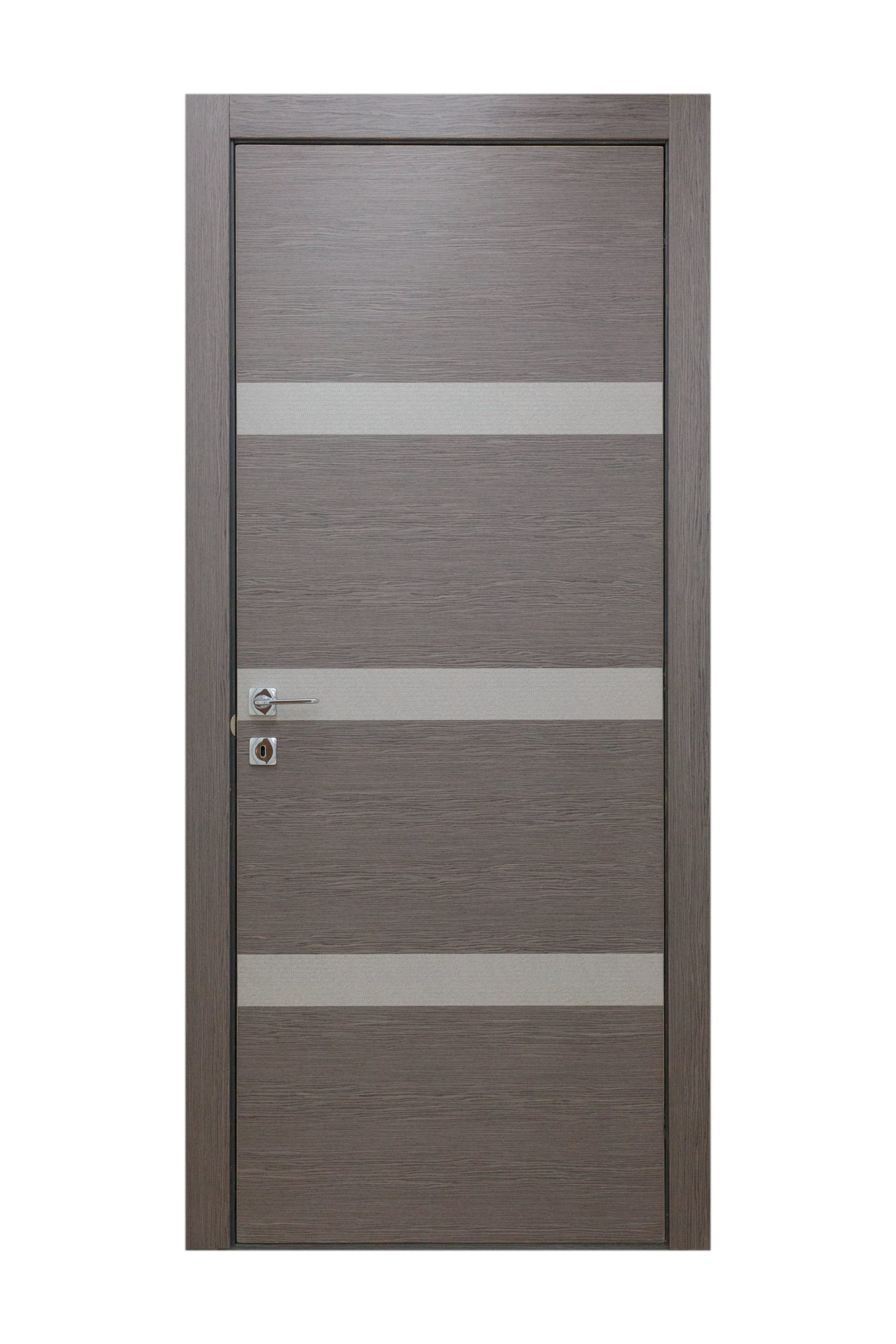 Porta in stile moderno trancia effetto alluminio con venature orizzontali e verticali ed inserti in vetro.