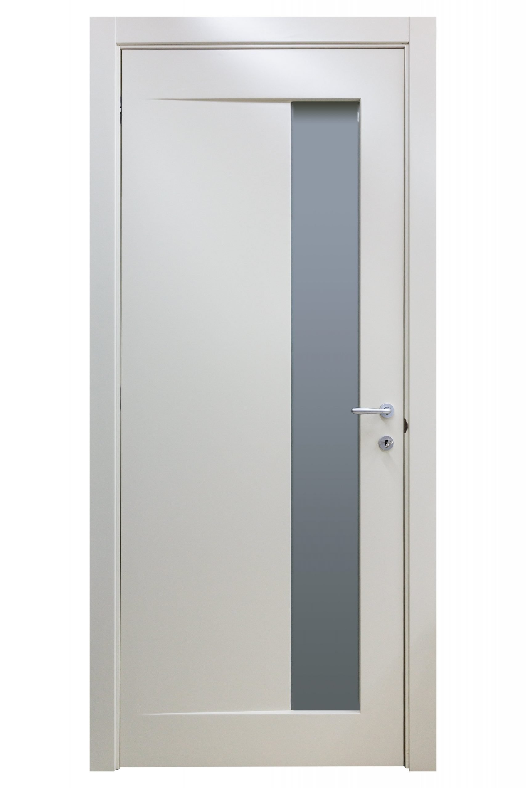 Porta in stile moderno lavorazione a sbalzo con inserto in vetro verticale. Finitura a scelta su basi e colori.